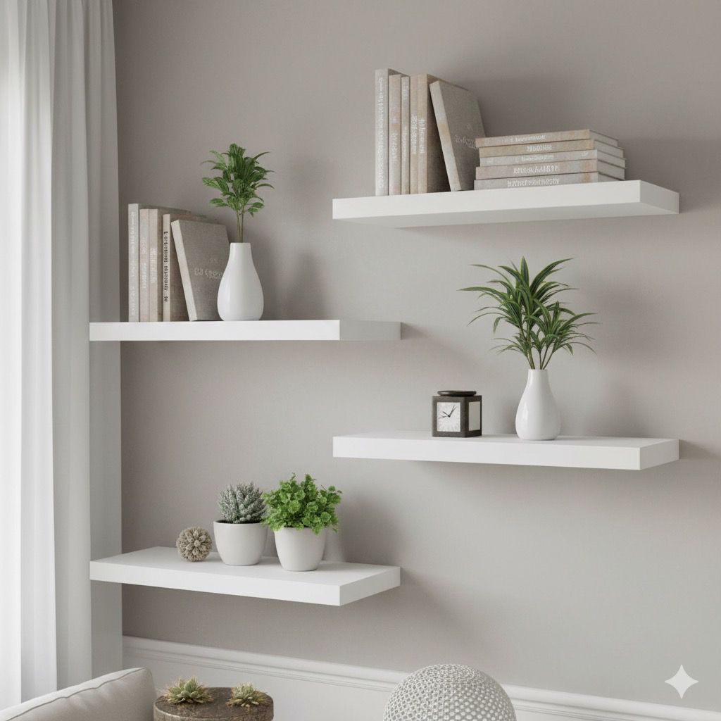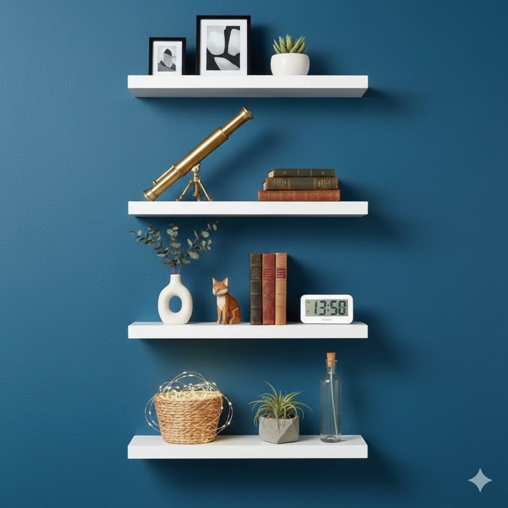 Juego de 4 repisas flotantes en RH chapillado blanco, ideales para sala, baño, cocina u oficina.